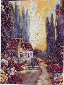 The 1930s ushered in the Great Depression and the greatest jigsaw puzzle craze in U.S. history. Technology had improved the die cutting machines used to stamp out cardboard puzzles to a point where production runs of millions a week were possible and actually achieved in 1932-1933. Many skilled workers were thrown out of work by the depression and thousands turned to producing hand-cut wood puzzles in their attics and garages. Whereas the 1909 era was dominated by female cutters, the 1930's was dominated by men. Because wood puzzles were considerably more expensive than die cut ones, small puzzle lending libraries sprang up along with sales of new hand-cut puzzles. With quality plywood readily available and power driven scroll saws selling for as little as $5, most puzzles produced were interlocking and some were notable examples of how intricate and complex a puzzle could be cut. With times hard and few able to afford travel, pictures selected tended to reflect a yearning for the exotic and foreign. Many small cutters simply “recycled” last year’s calendar pictures or tore pictures from old magazines. Thus, the same pictures were cut repeatedly by different cutters, all with their individual styles. By the late 1930's the puzzle craze had abated, the lending libraries closed and most cutters had moved on to other pursuits. There was a modest surge of interest in puzzles in WW II spurred by wartime scarcity of other forms of entertainment. Anne D. Williams, “Jigsaw Puzzles: An Illustrated History and Price Guide," Wallace-Holmstead (1990 but out of print). Williams, “The Jigsaw Puzzle: Piecing Together a History”, The Berkley Publishing Group (2004). Information about individual makers is also drawn from Ms. Williams' books. Images and descriptions of puzzles cut by many 1930/40s era makers are displayed below in alphabetical order by maker or brand, otherwise alphabetically by title if maker and brand are unknown..
